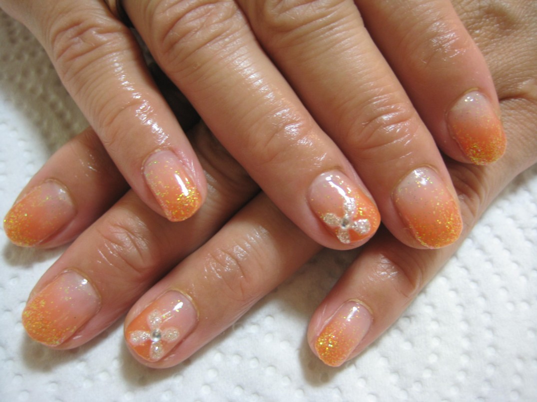 オレンジグラデーションにオレンジ系のラメをたっぷりコートして、薬指と親指にシルバーのお花を描きました。こちらのお花、画像ではわかりにくいですが、ジェルで作ったので少しぷっくりと盛り上がって可愛いです。真ん中にストーンをのせたので、まわりのシルバーラメと相乗してキラキラとジュエリーっぽく輝いてます♪ 参考価格¥7900(クリア¥4000+グラデーション¥1500+ラメがけ¥1000お花アート¥300×4本+ストーン¥200) ●営業時間についてはこちらから● |
