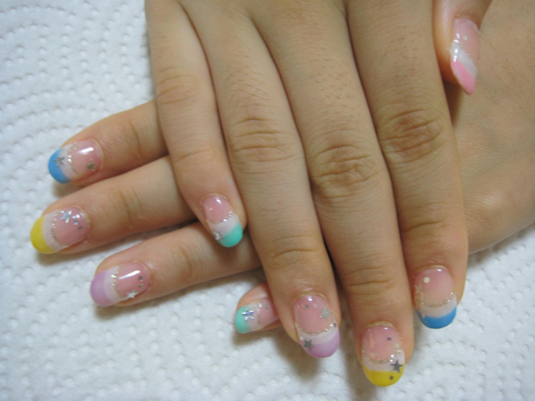 やりたいネイルの切抜きを持ってきてくれたのですが、エアブラシ使用のもので同じようには出来ずに申し訳ありませんでした。 若い子は指ごとに違う色を使うのが好みのようで、5本色違いです!パステル系の色でまとめたため、色は作成しました。白とのダブルフレンチに、シルバーのラメライン、星型ホロでアートと盛りだくさんです♪ とっても可愛く仕上がりました。 参考価格¥10500(クリア¥4000+ダブルフレンチ¥3000+ラメライン¥1000+ホロアート¥1500+オリジナルカラー¥1000) ●営業時間についてはこちらから● PR |