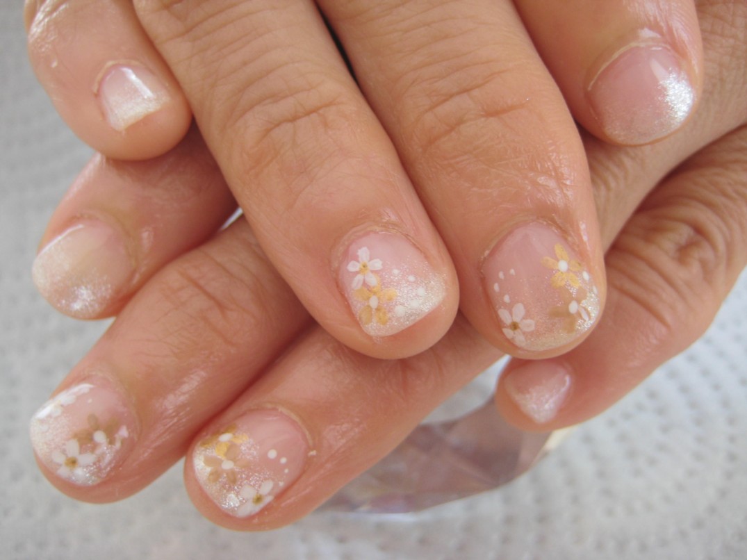 趣味でテニスをされるそうで、以前はテニスをしている最中にぶつけて爪が欠けることがあったそうですが、ジェルで保護しているので欠けなかったとの報告を頂きました。カルジェルは薄付きなのに、とても硬くなるので爪が頑丈になった気がするのも良い点です!ただ爪自体が本当に強くなっている訳ではないので、オフした時にこんなに薄かったっけ?と弱くなった感覚がします。自分でオフしてご来店されるまでに、欠けちゃった!という事がけっこうありますので、普段より爪を労わるようにしてくださいね。 今回はここのところ連続しております、白粒子のグラデーションに白、ゴールド、ベージュで小花を描きました。お花アートとっても似合っていました♪ 参考価格¥6300(クリア¥4000+グラデーション¥1500+グラデーションアート¥200×4本) ●営業時間についてはこちらから● |