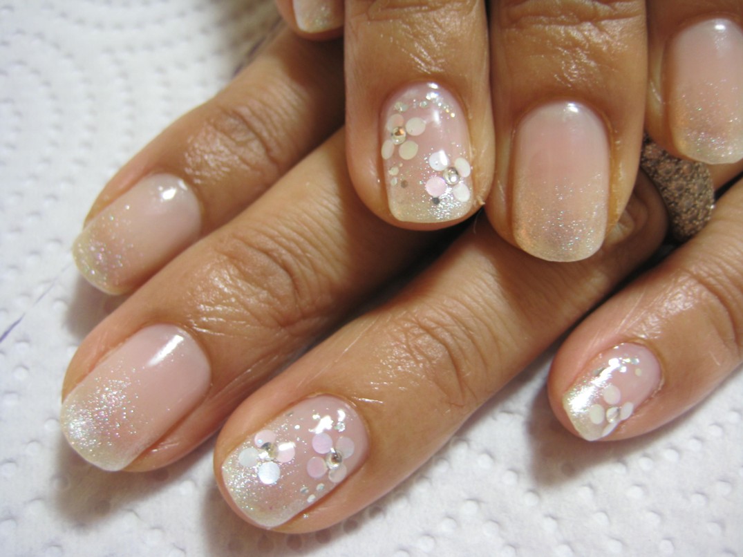 本日は白グリッターのグラデーションに、ホロとラインストーンでお花のアートを作りました。
