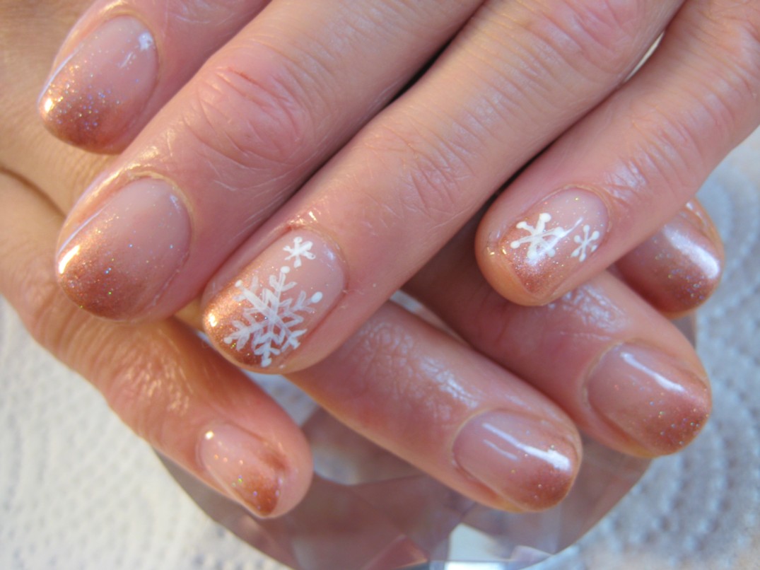 初めてのジェルネイルは韓国旅行中に体験されて、本日は2回目のネイルだそうです。韓国での施術はスピーディーでダイナミックだったようで、丁寧ですねと褒められ?嬉しかったです。 本日はブラウンパールのグラデーションに、トップはラメが入ったクリアでコートしたのが、シックなブラウンを華やかにしています。3本今月のアートの雪の結晶を描きました。 参考価格¥6400(クリア¥4000+グラデーション¥1500+グラデーションアート¥300×3本) ★こちらのグラデーションアートは12月中1本100です★ ★12月のグラデーションアートキャンペーンは雪の結晶と梅です★ |