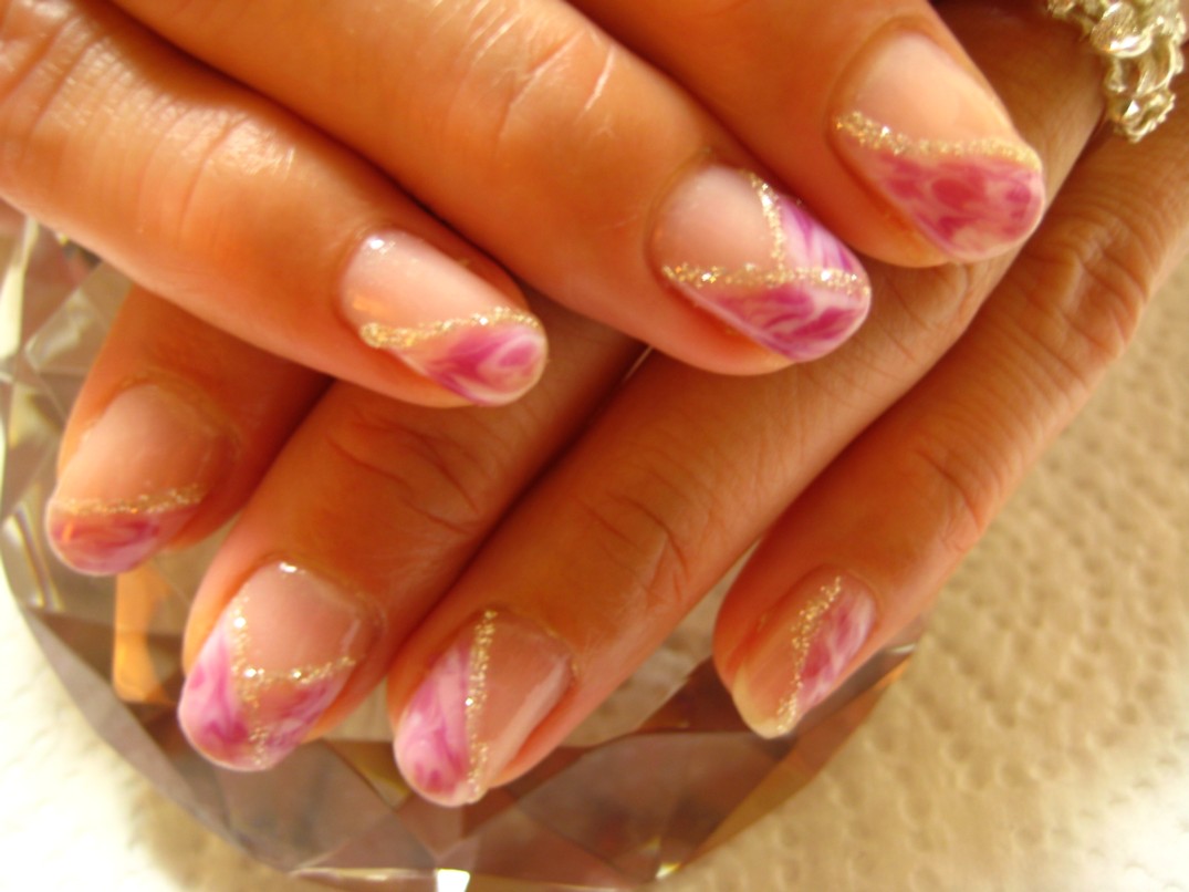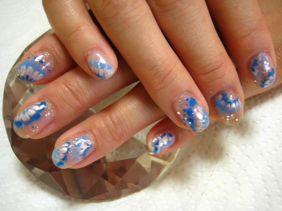 マーブル模様を色々を色々な配置でアートしました。全体かフレンチしか私の技術では難しいと思っていましたが、お客様のご要望に応えてやってみたところ、なかなか可愛い仕上がりに♪