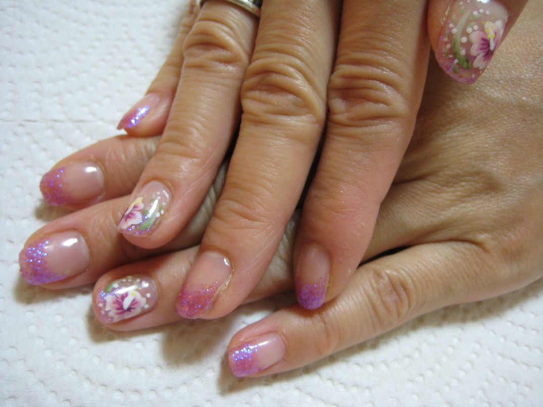 リピーターのお客様です。本日はハンド&フット一度に奇麗になってご満悦ですね♪ 手はピンクのラメグラデーションに親指と薬指にピンクのハイビスカスを描きました。足はオレンジとパープルとホワイトを使ってピーコックアートをしました。色がパステル系なのでパンチ力をプラスするため、大小のラメをところどころに散らしました。