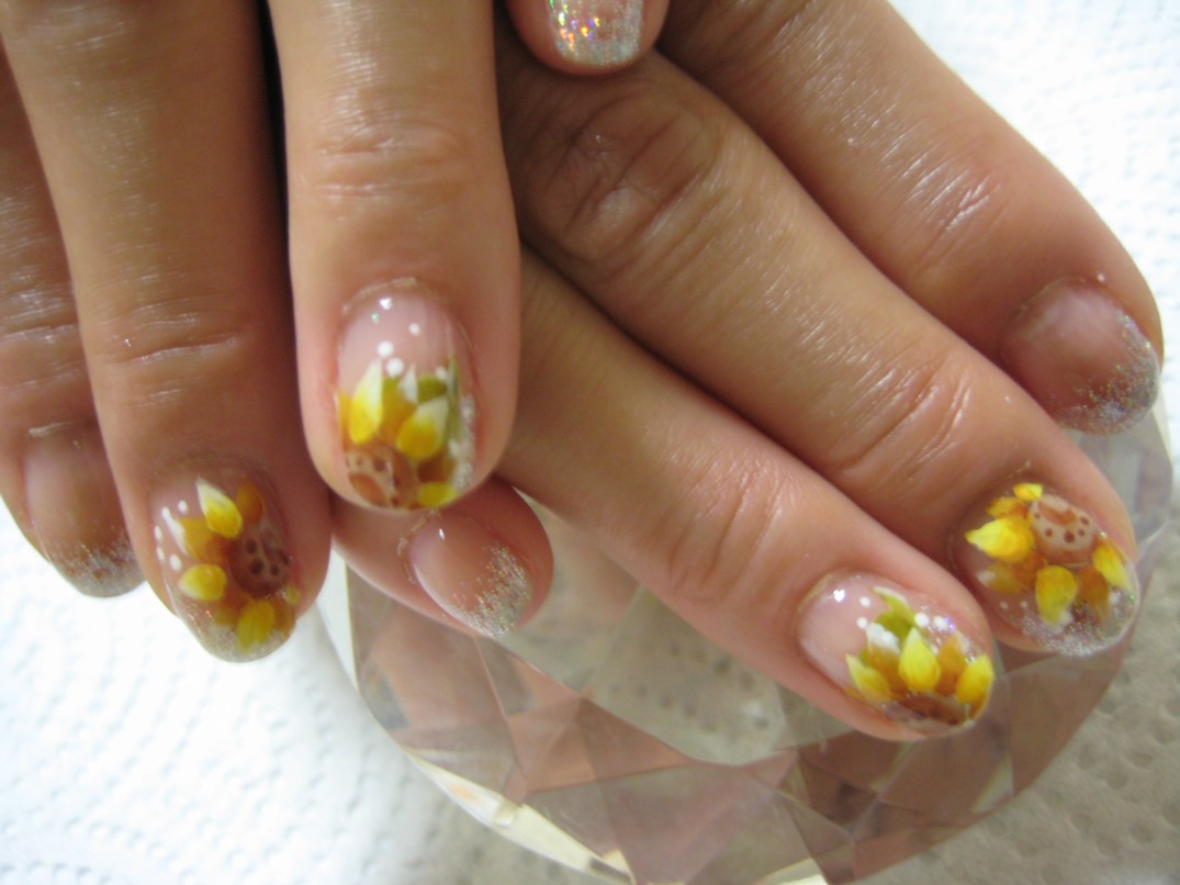 シルバーのラメグラデーションに親指、中指、薬指にアートしました。 ひまわりはアジサイに続いて花びらが多い花なので、描くのに時間がかかっちゃってスミマセン。。。 参考価格¥7300(クリア¥4000+グラデーション¥1500+グラデーションアート¥300×6本) ★こちらのグラデーションアートは7月中は1本100円です★ ★7月のグラデーションアートキャンペーンはひまわりとハイビスカスです★ |