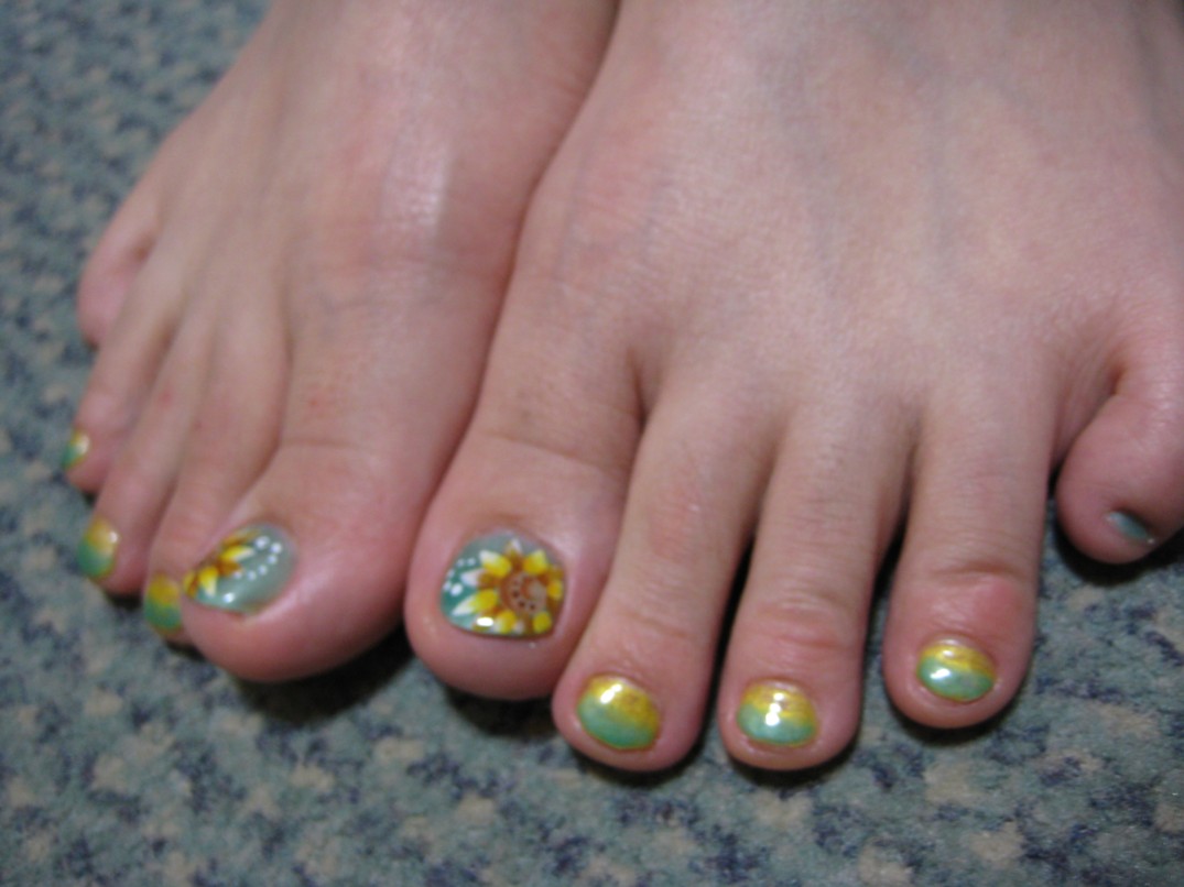 親指以外はベースはパールイエローで、パールグリーンでグラデーションにしました。 夏のフットネイルは大胆にしたくなりますね。 足に描くお花は大きめで、ハッキリしたものが良いように思います。あまり細かい柄だと見えにくいので。 参考価格¥7100(クリア¥4000+カラーベース¥1000+グラデーション¥1500+グラデーションアート¥300×2) ★こちらのグラデーションアートは7月中は1本100円です★ ★7月のグラデーションアートキャンペーンはひまわりとハイビスカスです★ |