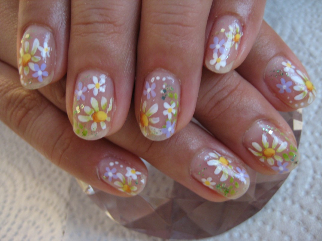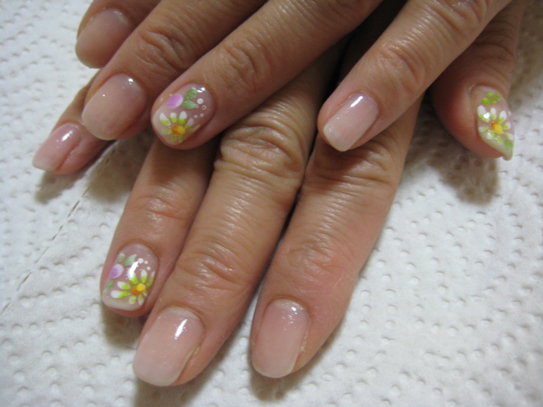フットとハンドをしてくれたのですが、フットの写真を撮るのを忘れてしました… オレンジのグラデーションがとっても可愛かったのに残念!親指にハンドと同じくマーガレットを描きました。 手の方は、ベースに白っぽい微粒子の入ったアイスを使いました。 形の良い縦長の爪なので、全部の指にマーガレットをしっかり描けて私としても大満足。 参考価格¥7000(クリア¥4000+グラデーションアート¥300×10) ★6月のグラデーションアートモデル募集はアジサイとバラです★ |