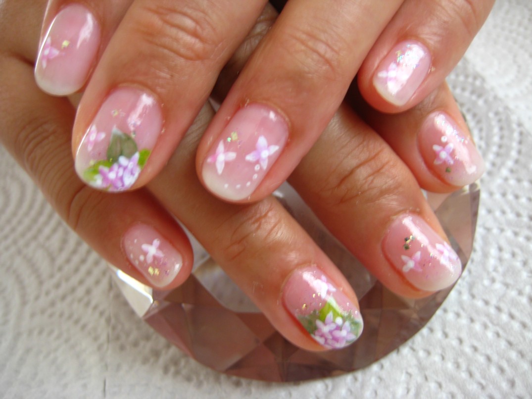 マニキュアと落とす方法がまるで違うので、初めて落とす時はネイリストにやってもらって下さいね。 最近はカルジェルが随分世の中に浸透して、ホームケアグッズが手に入りやすくなりました。それはとても便利なことですが、使い方は浸透していないので、思い込みでやってみると大変です。力ずくで擦り落とさないと落ちないようだと、何かやり方が間違っています!正しい方法で落とせば楽に落とせますからね。 本日ようやくアジサイアートのオーダーが入りました♪ 01番(クリームホワイト)のグラデーションにピンクのアジサイです。ところどころに大小のラメを散して、雨の雫をイメージしてみました。 参考価格¥8500(クリア¥4000+グラデーション¥1500+グラデーションアート¥300×10本) ★6月のグラデーションアートモデル募集はアジサイとバラです★ |