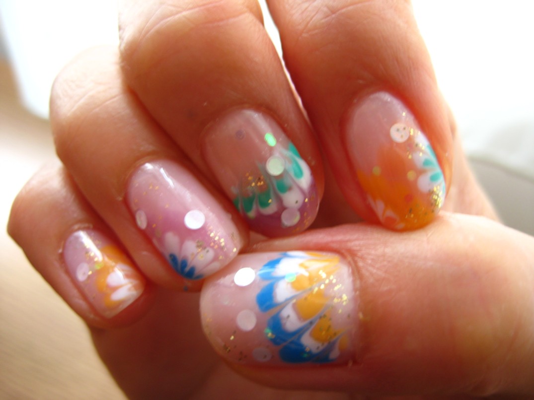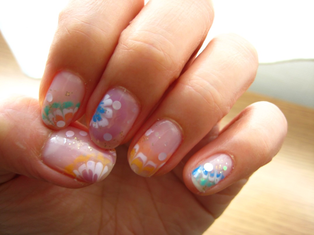 左手で右手を施術するのは至難の技!本当はグラデーションアートを描きたいところですが到底無理なので、今回もまだはまっているピーコック模様にしました。 ベースは23番(ピンクキャンディ)色々な向きにピンク、白、ブルー、グリーン、イエロー、オレンジの6色でピーコックを描き、大小のホロとゴールドのラメをところどころに散しました。 かなり個性的ですが、実際見るとパステルカラーなので手が浮いている感じはしません。 色々なピンクバージョンというのも良さそうですね♪ 参考価格¥8000(クリア¥4000+カラー¥1000+ピーコック&ホロアート¥300×10本) ↓右手 ↓左手 ★6月のグラデーションアートモデル募集はアジサイとバラです★ |